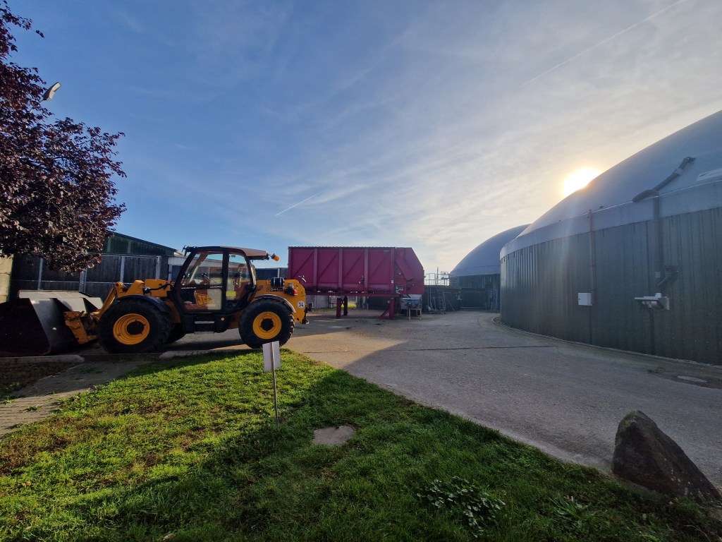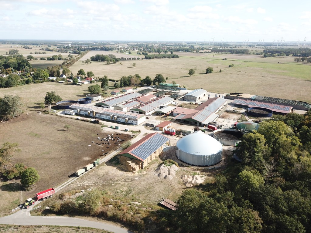 Um auch die Exkremente unserer Herden zu nutzen und besser in den Kreislauf einzubinden, haben wir eine Biogasanlage. Hier produzieren wir unseren eigenen Strom und speisen den Überschuss ins öffentliche Netz ein. Außerdem entsteht dabei Wärme, die wir in der Tierproduktion, für die Getreidetrocknung und für das Verwaltungsgebäude nutzen.